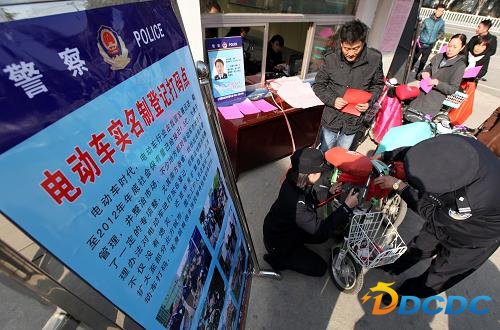 11月28日,枣庄市公安局市中分局光明路派出所民警在为电动自行车打码登记上“户口”。当日起,山东省枣庄市公安局为加强电动自行车管理,防范电动自行车盗窃、销赃,在全市范围内启动给电动自行车免费实名登记工作,本着群众自愿的原则,登记群众个人所属电动自行车的电机和车架号码,喷打编写有群众身份信息的电动自行车识别号码,统一为电动自行车上“户口”,并录入公安系统信息管理平台。新华社发(孙中喆 摄)